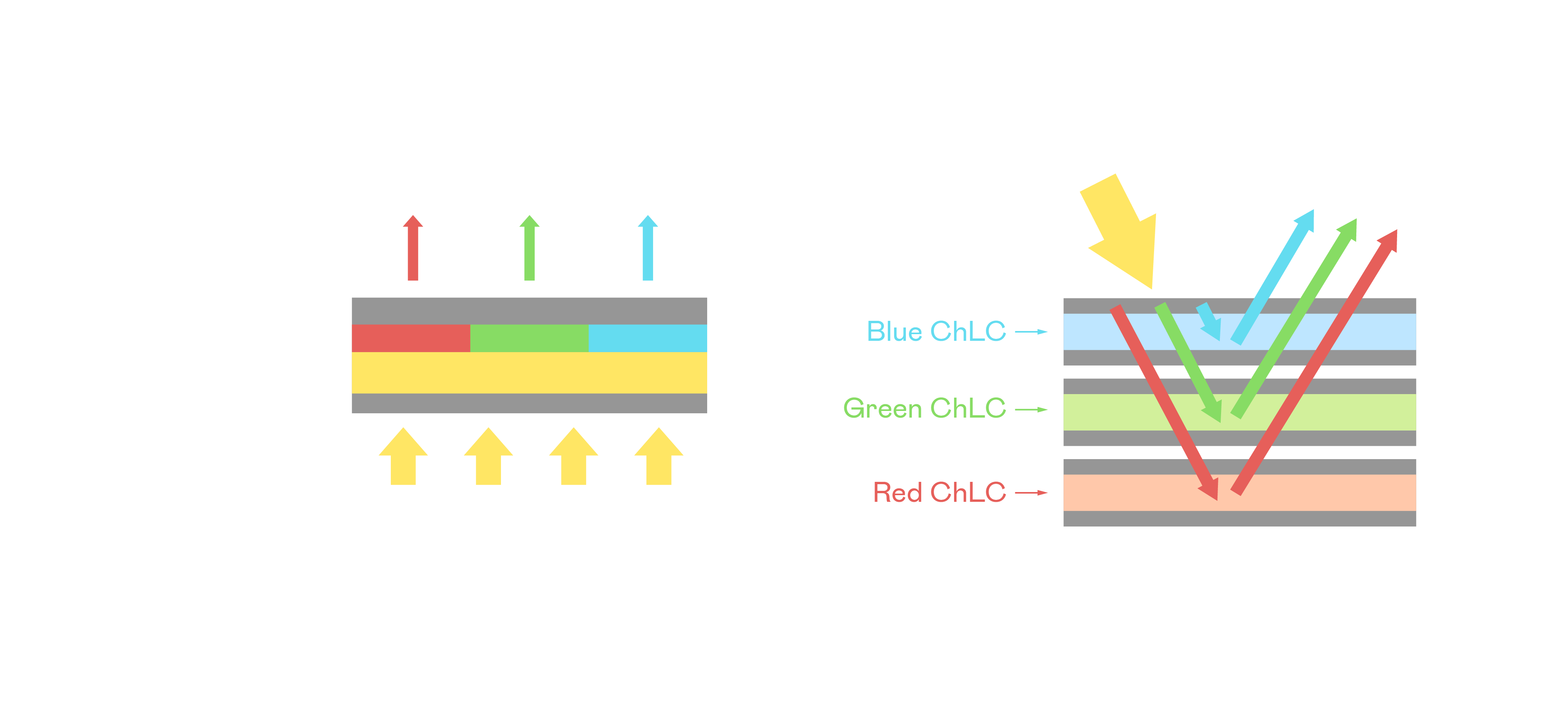 九游胆固醇液晶显示器是由红、绿、蓝三层胆固醇液晶面板堆叠而成,并采用无彩色滤光片设计,减少环境光在反射过程中的损耗。